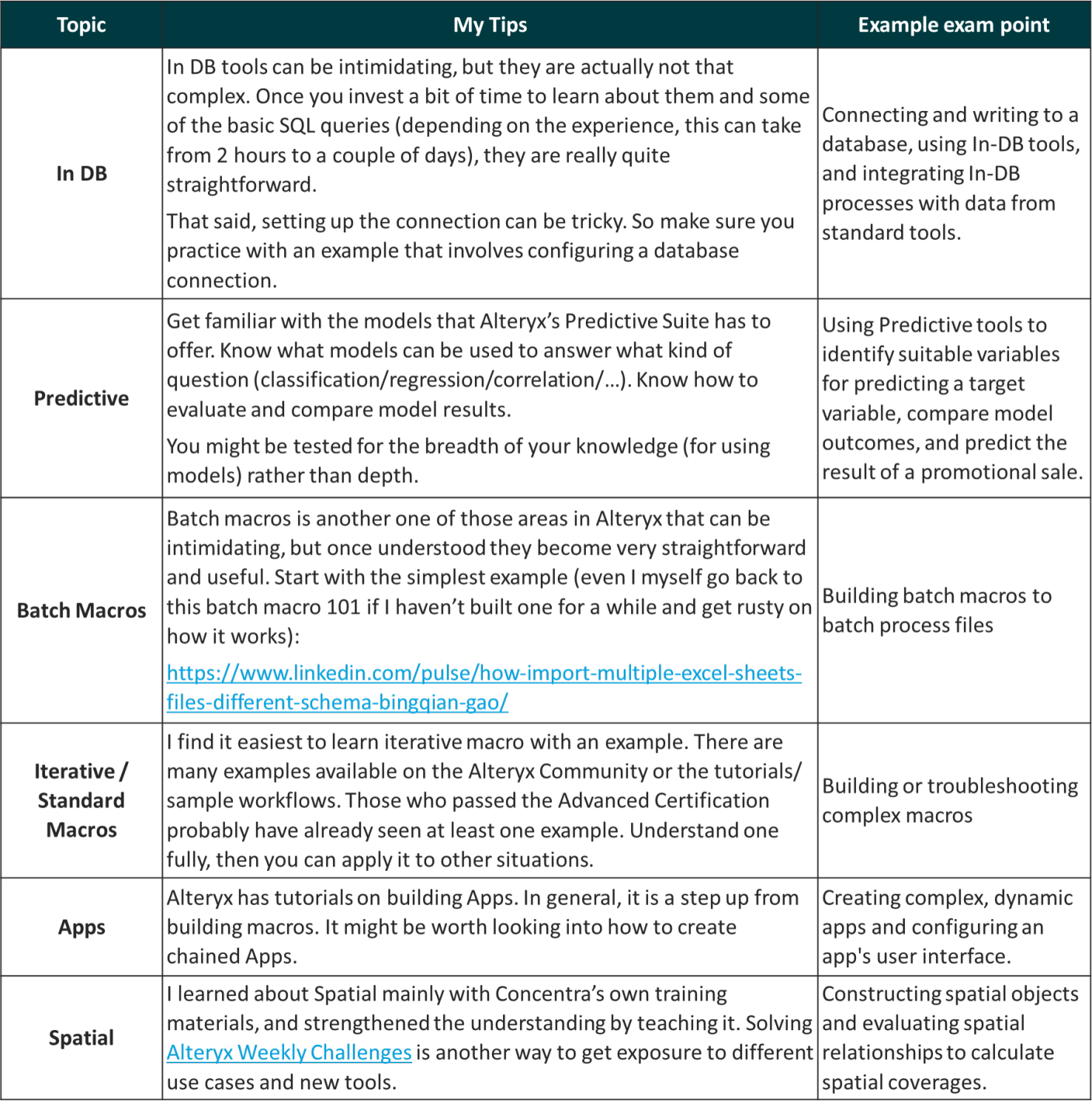 The exam will build on the knowledge and skills you demonstrated on the Advanced Exam, and more. It aims to cover the broad capability Alteryx has to offer. Therefore, it is important to ensure you are comfortable with a range of topics (I will come back to this with more details further down), especially if there are “blind spots” due to the nature of your everyday work.